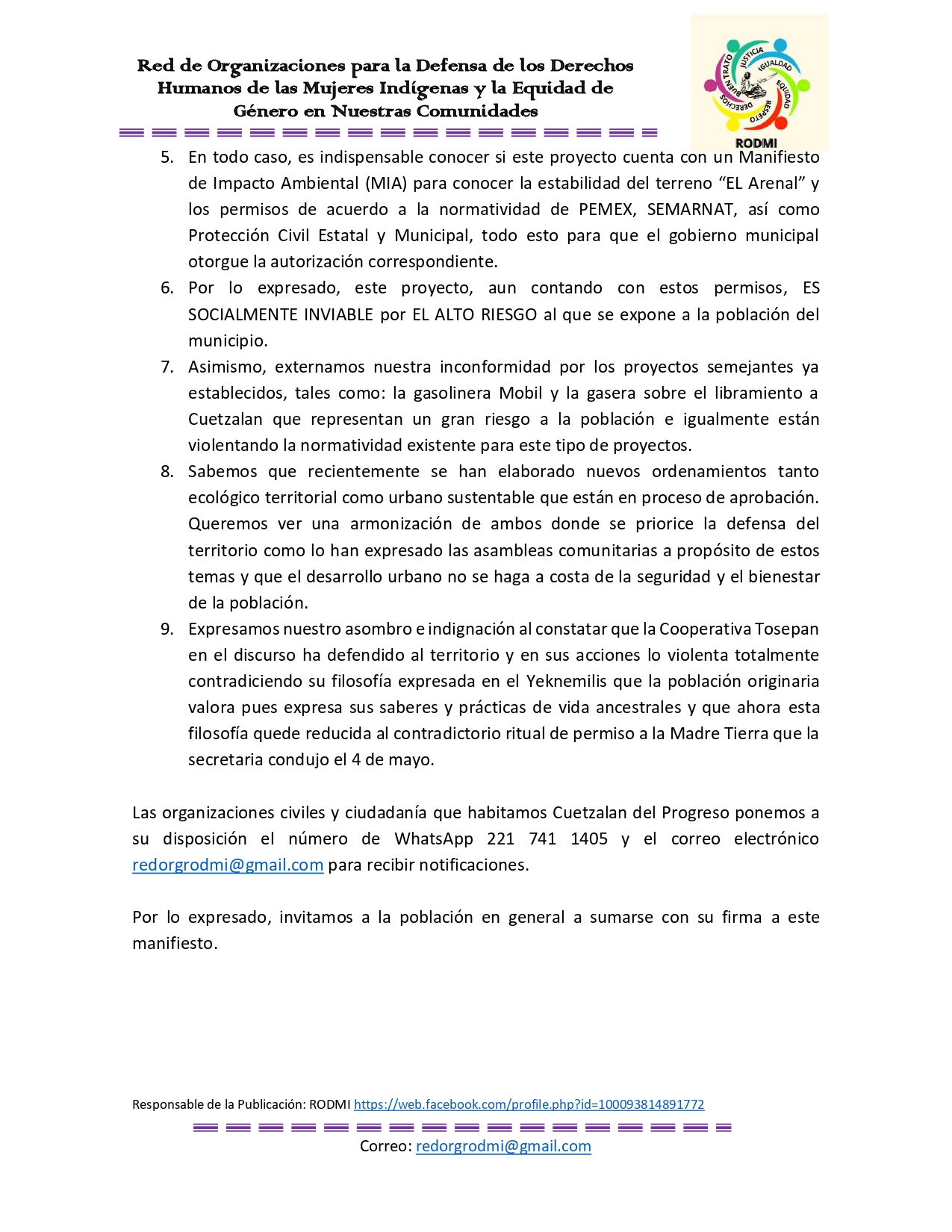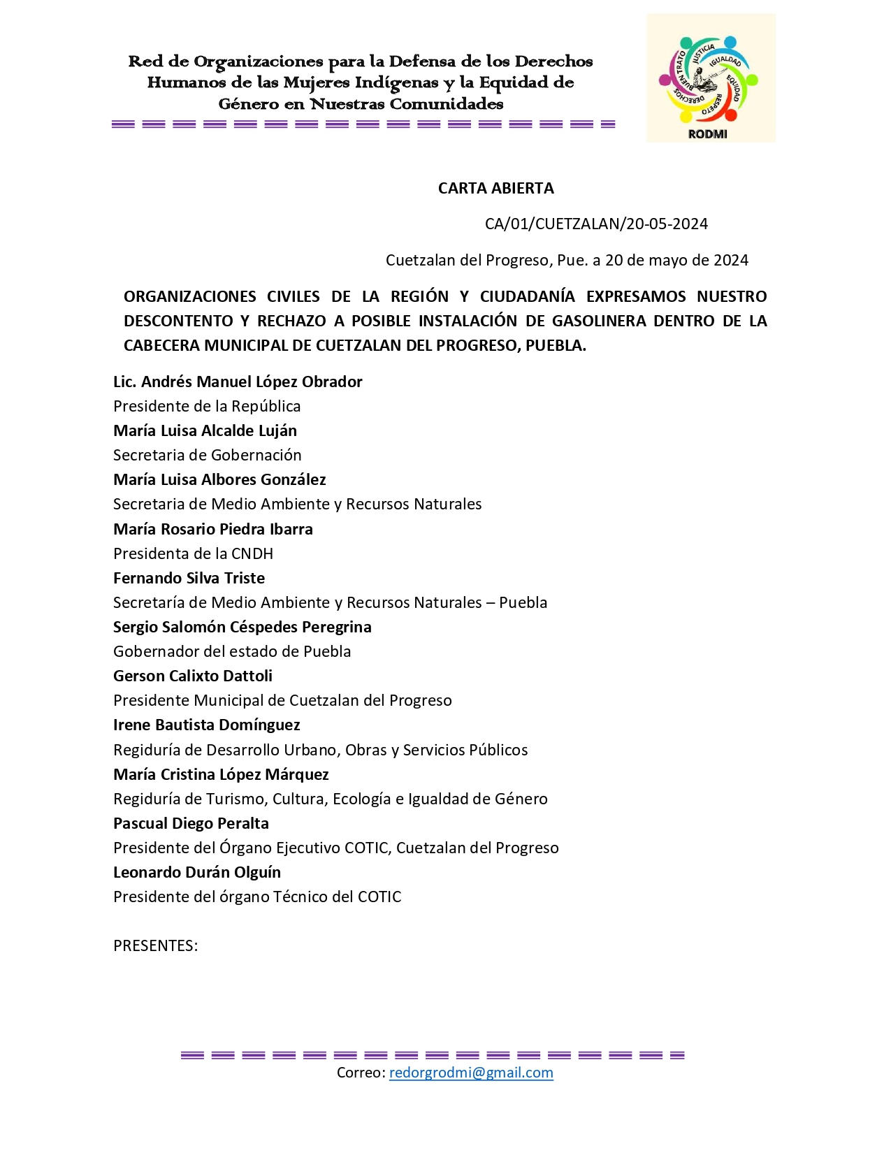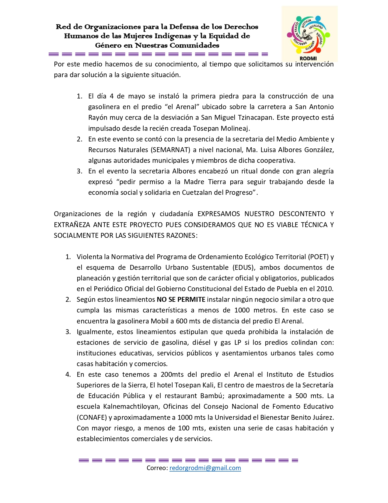 CARTA ABIERTA-RECHAZO A POSIBLE INSTALACIÓN DE GASOLINERA DENTRO DE LA CABECERA MUNICIPAL DE CUETZALAN DEL PROGRESO, PUEBLA.